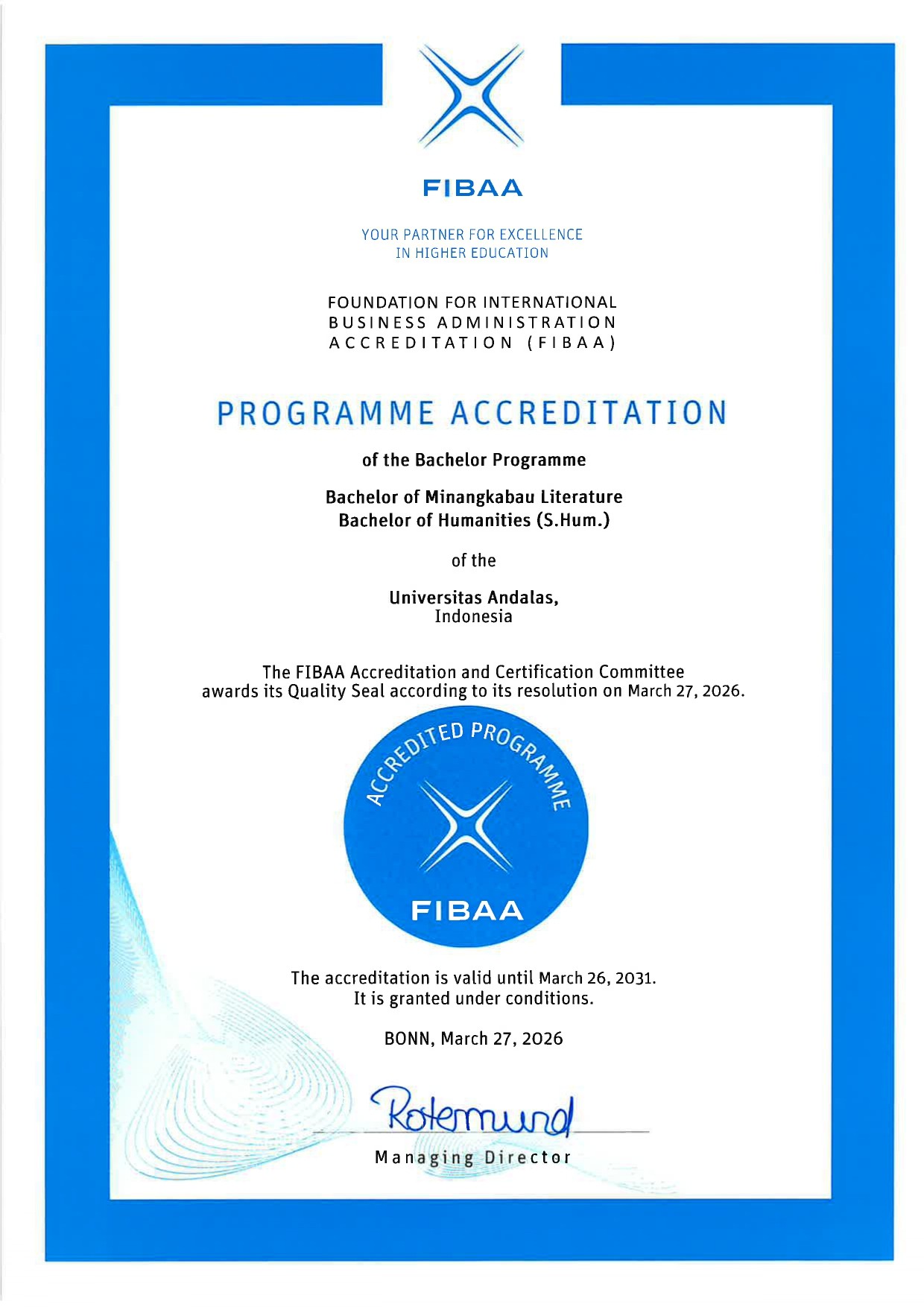 Gambar 2. Sertifikat akreditasi internasional FIBAA Jerman Program Studi Sastra Minangkabau