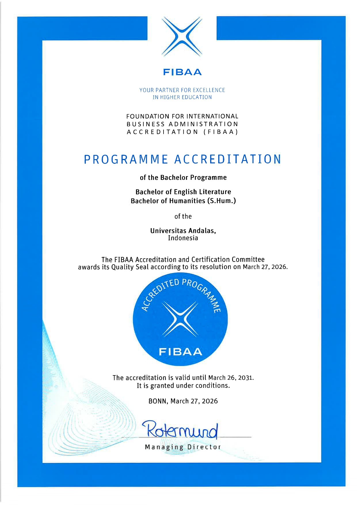Akreditasi ini diberikan berdasarkan penilaian kualitas program pendidikan sarjana yang memenuhi standar internasional, sebagaimana tercantum dalam sertifikat resmi FIBAA yang diterbitkan pada 27 Maret 2026 dan berlaku hingga 26 Maret 2031.