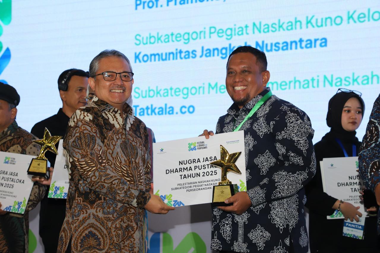 Gambar 1. Prof. Pramono, S.S., M.Si., Ph.D., dosen FIB Unand, menerima Penghargaan Nugra Jasa Dharma Pustaloka Tahun 2025 dari Perpustakaan Nasional Republik Indonesia (Perpusnas RI) atas kiprahnya dalam pelestarian naskah kuno Nusantara