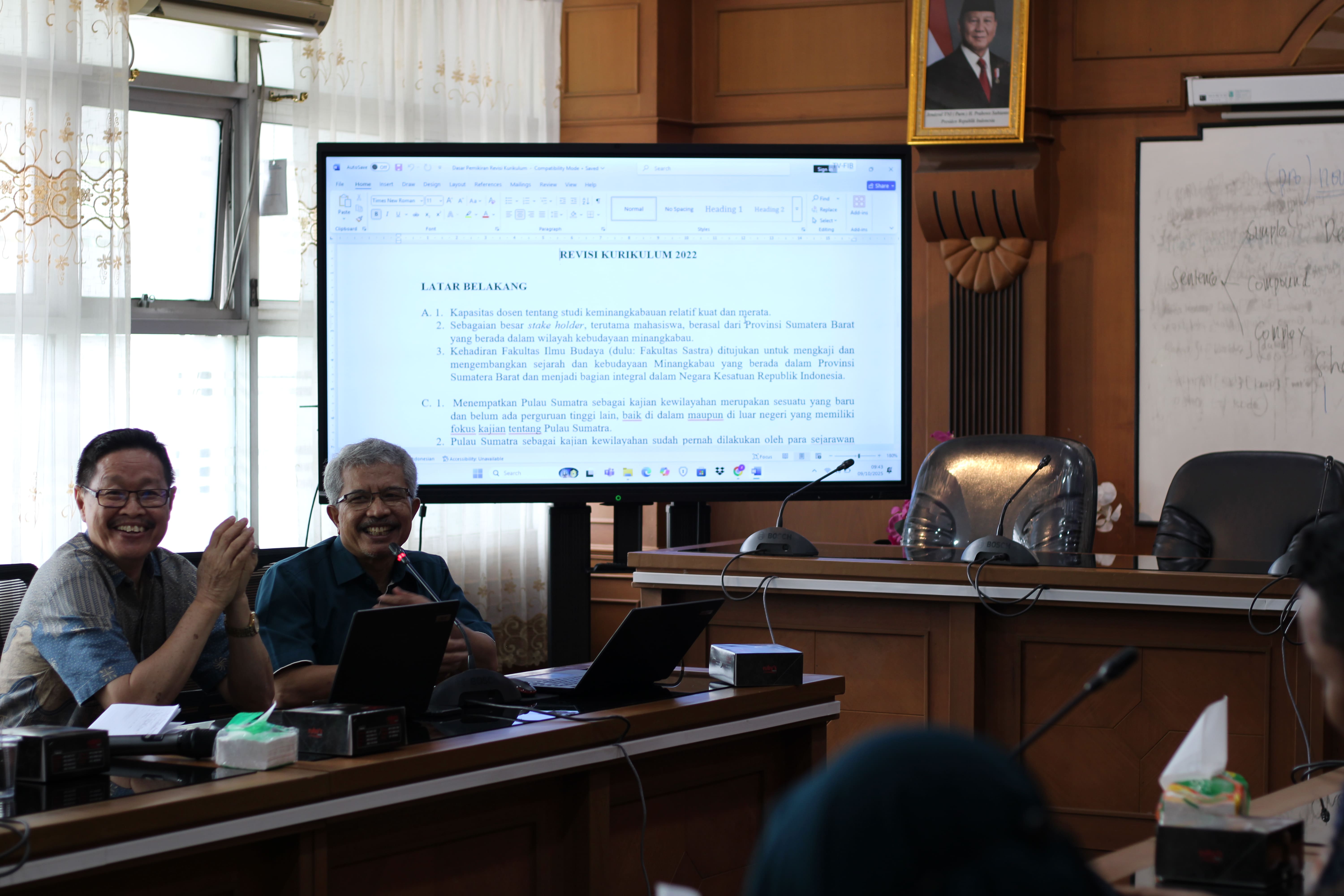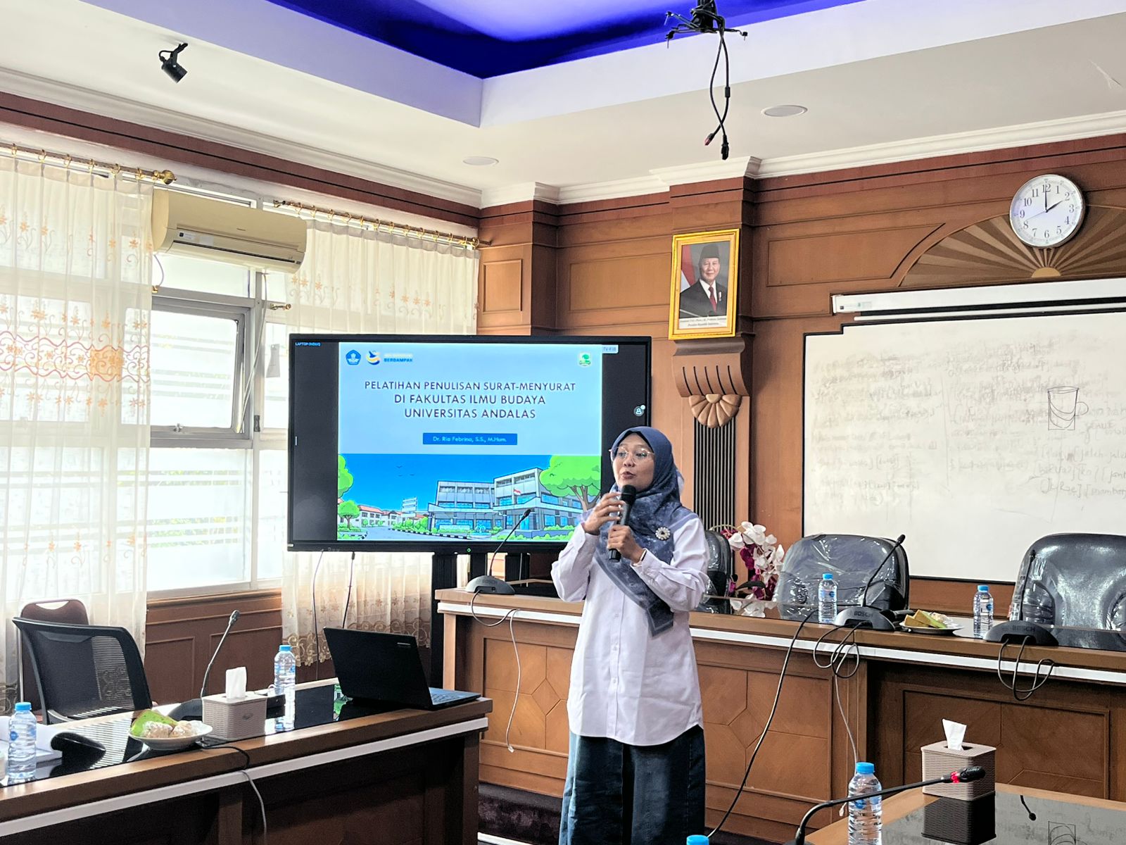 Dalam sesi pemaparan materi, Dr. Ria Febrina, S.S., M.Hum. menekankan pentingnya membangun minat dan kepekaan terhadap budaya sebelum menulis. “Ketika seseorang memiliki ketertarikan mendengar orang bercerita, suka berdiskusi, dan gemar membaca, hal itu menjadi dasar bagi mereka untuk menulis sekaligus memahami budaya warisan Minangkabau. Misalnya, kata ani-ani yang sering dipahami secara negatif, padahal dalam tradisi Minangkabau merupakan alat untuk memotong padi,” ujarnya.